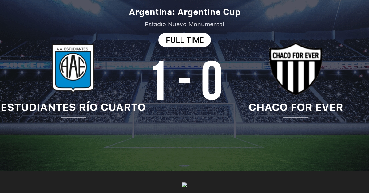 . Football Soccer Match Estudiantes Rio Cuarto vs Chaco For Ever Result and Live Scores Details. X Chaco For Ever Estudiantes Río Cuarto. Estudiantes Rio Cuarto - Chaco For Ever en vivo Copa ArgentinaARGENTINA. Copa Argentina - 132 de final.Estudiantes de Rio Cuarto won 2 direct matchesCA Chaco For Ever won 0 matches0 matches ended in a drawOn average in direct.